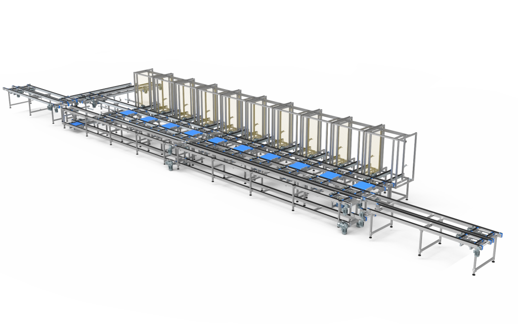 Het basis transfer systeem is multi-inzetbaar, door gebruik te maken van standaard pallets is het relatief eenvoudig om serie grootte, omstel en volume flexibiliteit toe te passen.