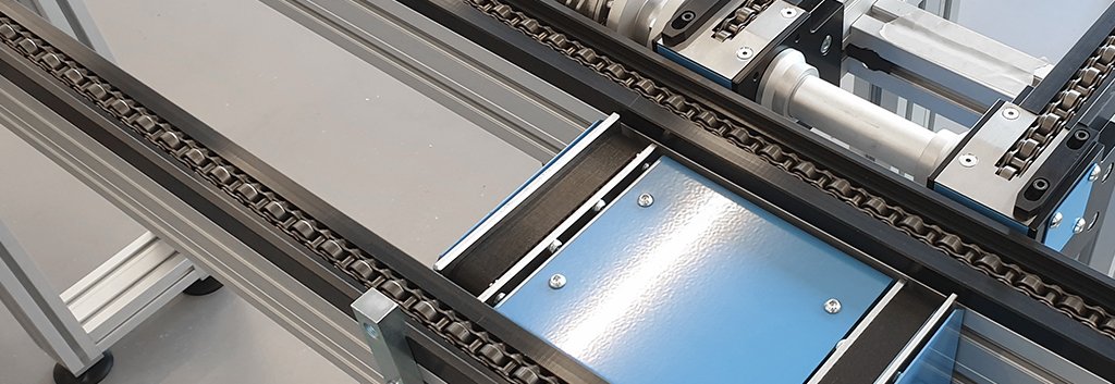 Tesamen met de speciale accumulerende ketting is dit een ideaal transportsysteem om pallets van en naar gedefinieerde posities te verplaatsen.